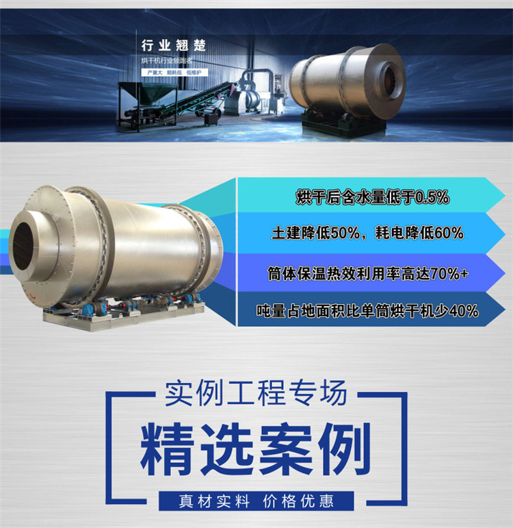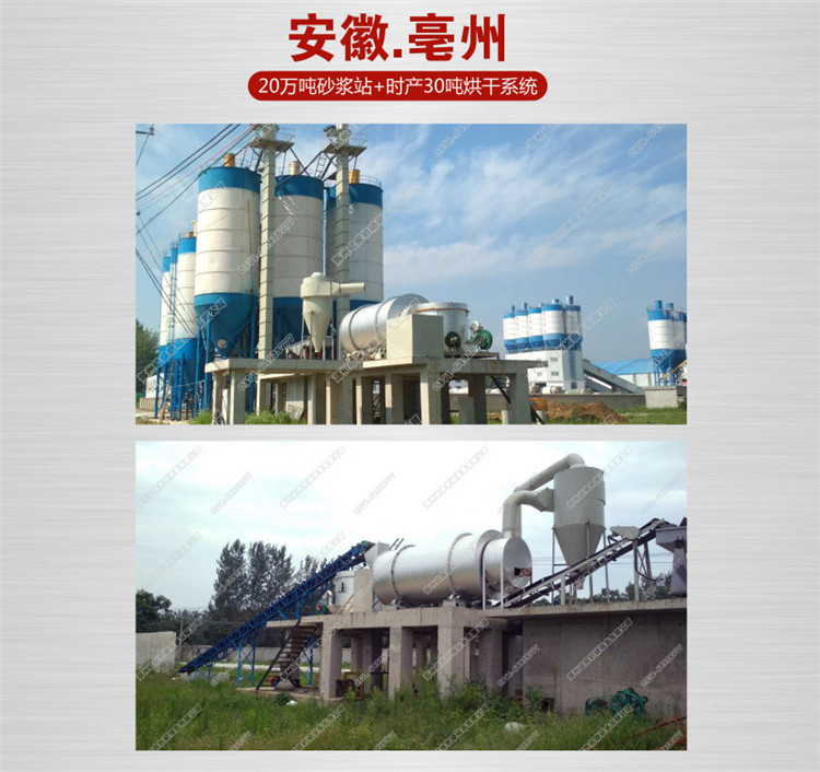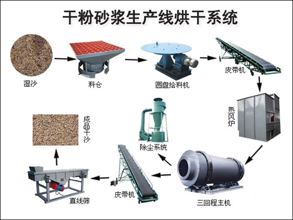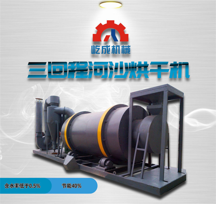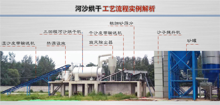 河沙通過皮帶輸送機到達料斗進入到 加料管(流沙管),依靠加料管的傾斜度,物料進入到三回程河沙烘干機的內(nèi)部,載熱體從低端進入后,與河沙形成逆流接觸,在筒體內(nèi)部對物料進行加熱,在圓筒的轉動之下,河沙經(jīng)過三個來回的流動烘干,終在自身的重力作用下,到達出料口經(jīng)過接料斗排除,之后物料通過皮帶輸送機進入到振動篩進行篩分,成品沙的生產(chǎn)算是完成了。