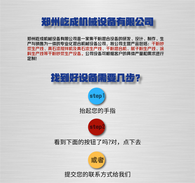 鄭州屹成機械設備有限公司是一家集干粉混合設備的研發(fā)、設計、制作、生產(chǎn)與銷售為一體的專業(yè)化混合機械設備公司,我公司主營產(chǎn)品包括:干粉砂漿生產(chǎn)線、真石漆攪拌機及真石漆生產(chǎn)線、干粉混合機、膩子粉生產(chǎn)線、涂料生產(chǎn)線等干粉砂漿生產(chǎn)設備。公司設備可根據(jù)客戶的具體產(chǎn)量和需求進行定制!公司地址:河南省滎陽市s232省道與科學大道交匯處向南1公里路東。聯(lián)系電話0371-64928777,微信15617783000,QQ1610666498,企業(yè)網(wǎng)站m.jxycpeixun.com期待您的來電咨詢。