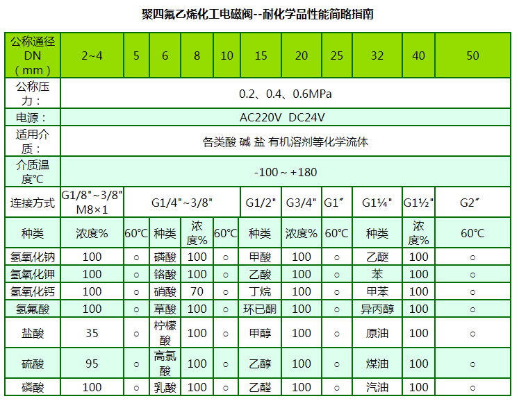 聚四氟乙烯化工電磁閥具有優(yōu)異的耐腐蝕性能,對所有的常用化學(xué)品都呈惰性。幾乎可以抵抗所有化學(xué)介質(zhì)(包括濃硫酸和王水)。具有優(yōu)異的耐熱性能,應(yīng)用溫度為-100~180℃,材料可長期在230~260℃下工作。特別適合腐蝕嚴(yán)重、溫度高且化學(xué)品不允許與潤滑劑接觸的環(huán)境。