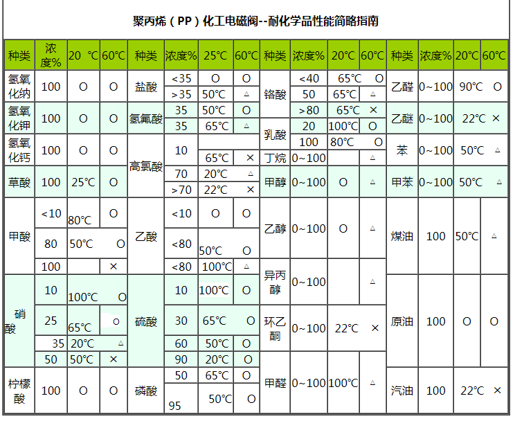 聚丙烯(PP)化工電磁閥具有優(yōu)良的耐腐蝕性能,在80℃下能耐除氧化性外的一般無機(jī)酸、堿、鹽、氣體、水等的腐蝕。它對極性有機(jī)溶劑和強(qiáng)極性的羧酸、醇類有較大的抗溶劑能力。少數(shù)氧化性酸在濃度較高時(shí)對其有較大的腐蝕作用。有一定的剛度和強(qiáng)度,適用溫度為-0~120℃。