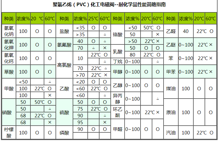 聚氯乙烯(PVC)化工電磁閥具有優(yōu)良的耐腐蝕性能,耐酸(包括稀硝酸)、堿、鹽、氣體、水等的腐蝕。對無極性的烷烴及強極性的羧酸、醇類有較大的抗溶劑能力。少數氧化性酸在濃度較高時對其有較大的腐蝕作用。有一定的剛度和強度,適用溫度為-0~60℃。